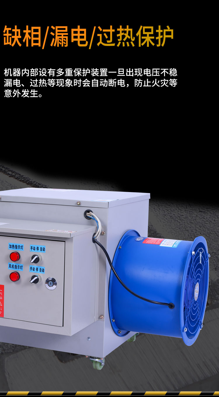 電熱風(fēng)機(jī)適應(yīng)范圍:主要用于在工業(yè)廠房的采暖,車間供暖,倉庫烘干,也可用于養(yǎng)殖場加溫,育雛預(yù)熱等。還可以用于農(nóng)產(chǎn)品烘干干燥,加熱、保溫、防凍之用。適用于較小面積的局部加熱、升溫、烘干。